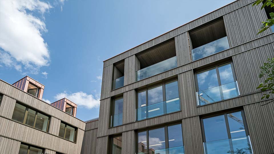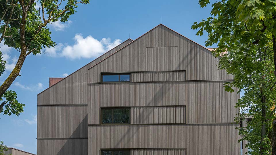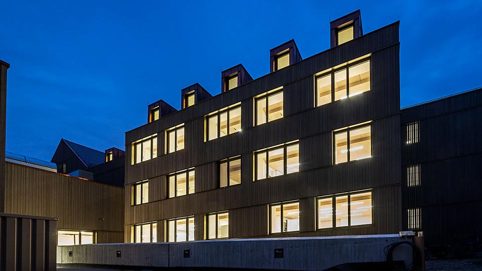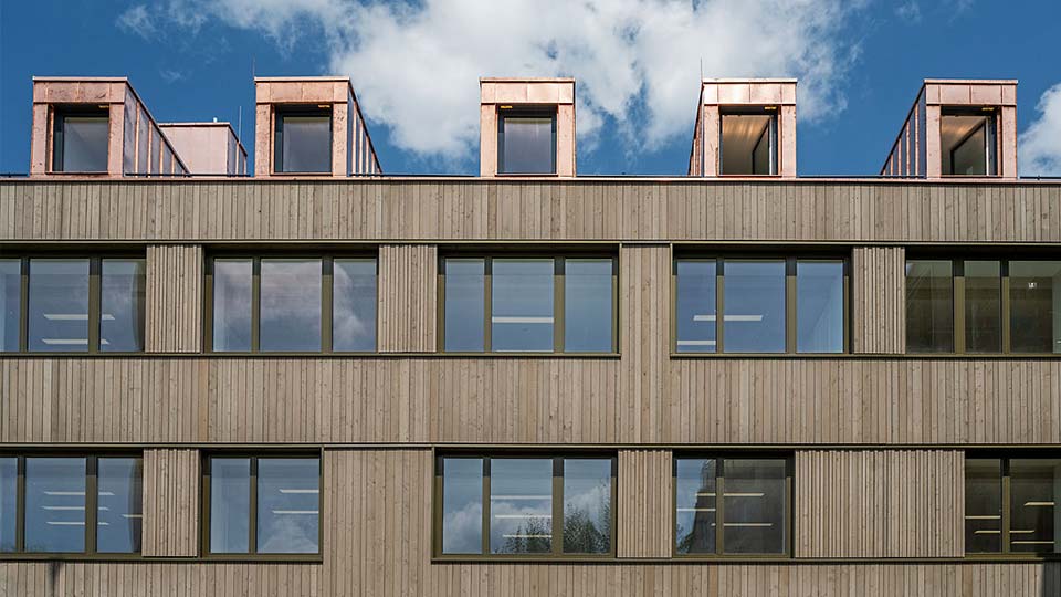 Ein zentraler Aspekt der Planung war die energetische Optimierung der Gebäudehülle. Beide Baukörper wurden mit einer neuen, selbsttragenden Holzrahmenbau-Konstruktion ausgestattet. Diese vorgefertigte Holz-Element-Fassade umfasst moderne Holz-Aluminium-Fenster und erfüllt höchste energetische Standards. Als Grundlage für die exakte Planung und die passgenaue Montage der Holz-Elemente an die bestehende Substanz diente ein zu Projektbeginn erstellter 3D-Scan, der das Gebäude digital und millimetergenau erfasste.