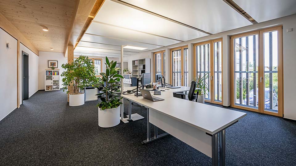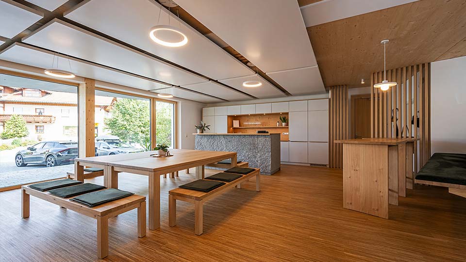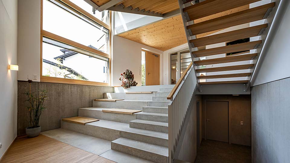 Die Konstruktion basiert auf Baubucheträgern und Brettsperrholzdecken (BSP), die präzise verarbeitet und teilweise sichtbar belassen wurden – ein klares Statement für handwerkliche Qualität und die ästhetischen Möglichkeiten des Holzbaus. Das Gebäude ist mit einem Stehfalzdach mit Photovoltaikanlage sowie Holz-Aluminium-Fenstern ausgestattet, die energieeffiziente Standards mit langlebigen Materialien verbinden.
