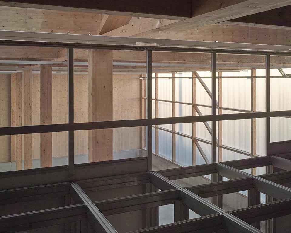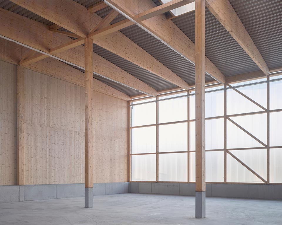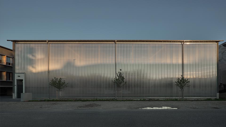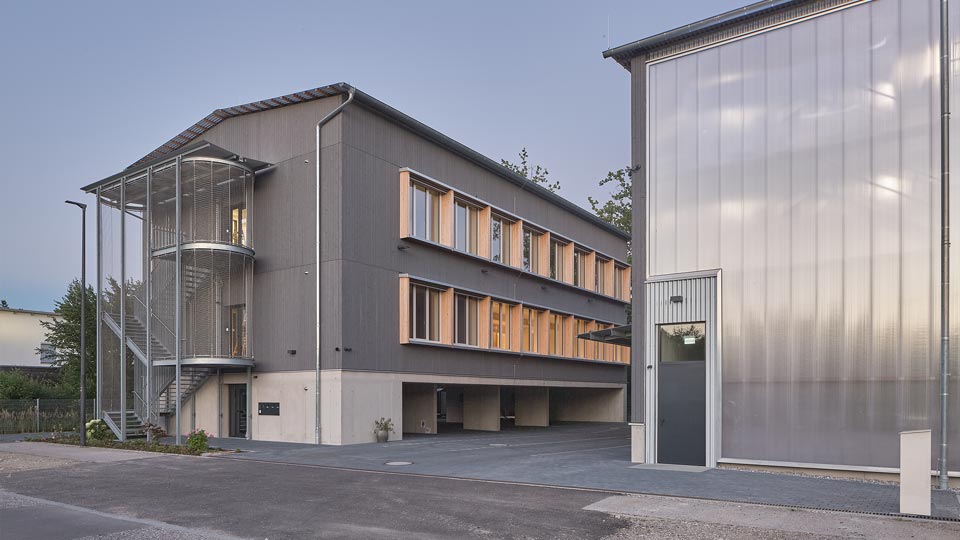 Die beiden Baukörper markieren den Eingang ins Gewerbegebiet und prägen das Straßenbild mit einer klaren Formsprache: Während die Halle mit ihrer transluzenten Fassade als funktionale Arbeitsfläche dient, öffnet sich das Bürogebäude mit einer eleganten Holzfassade und einer skulpturalen Stahltreppe zur Straße hin.