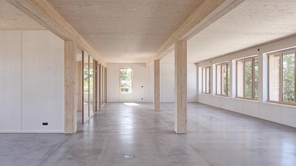 Ein durchdachtes Konstruktionsraster ermöglicht effiziente Abläufe und schafft durch großzügige Fensterflächen sowie natürliche Materialien ein erstklassiges Arbeitsumfeld.