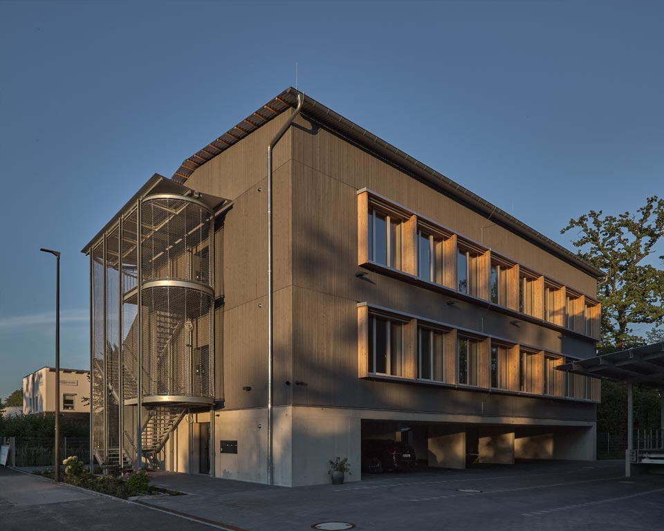 Das Ensemble aus einem dreigeschossigen Bürogebäude und einer angrenzenden Lagerhalle steht exemplarisch für den intelligenten Materialeinsatz im modernen Holzbau.