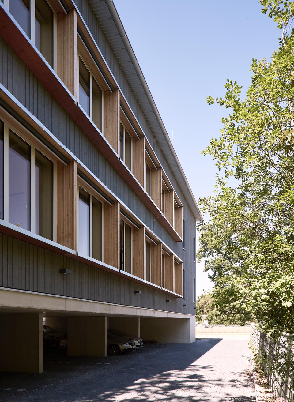 Holzbau oberirdisch, Stahlbeton für Keller und Parkgeschoss