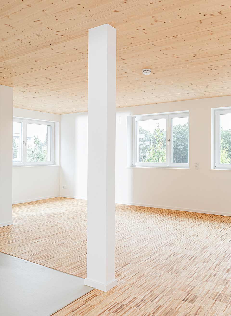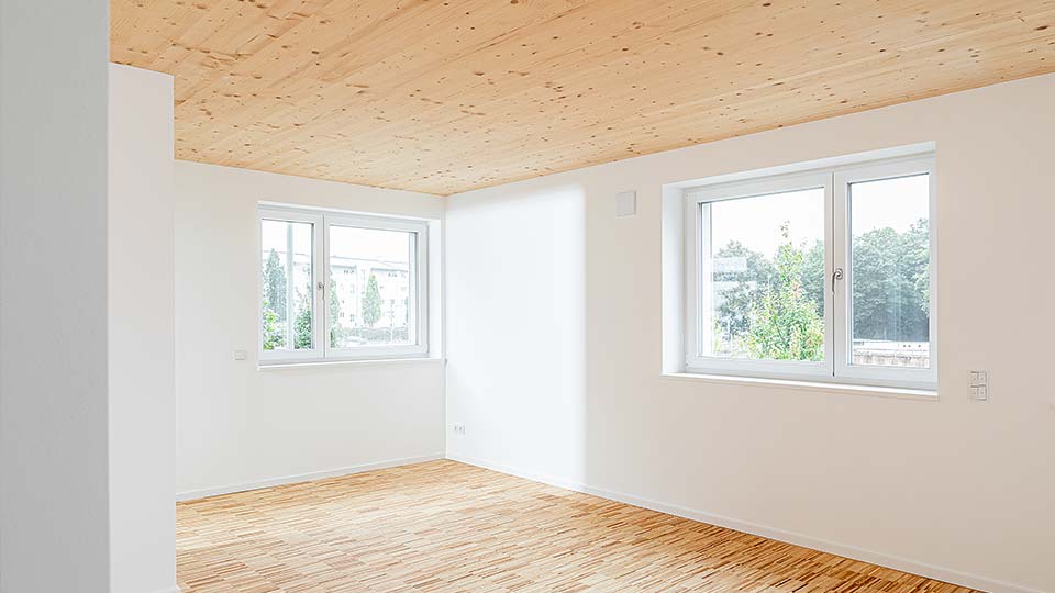 Unser Leistungsumfang umfasste die tragenden Außenwände inklusive Fenster, Fassade und Verschattung, die tragenden Innenwände sowie Decken und Dach aus BSP.